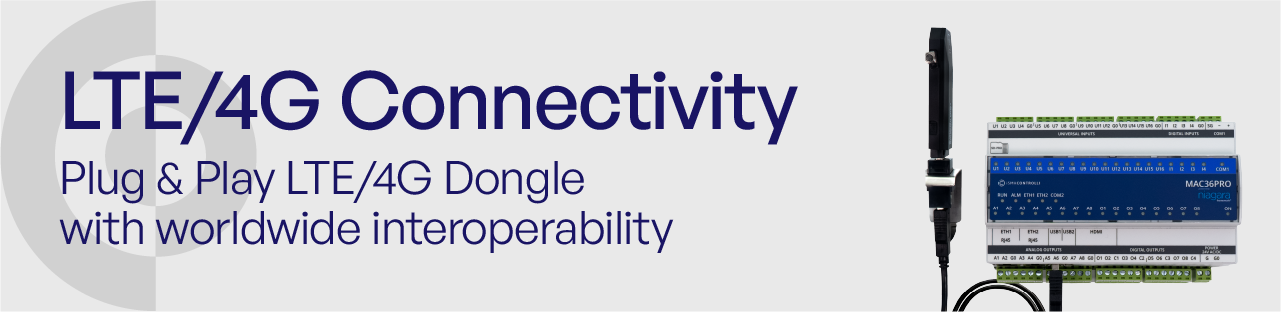 Nový LTE-DIN-EXT-SET umožňuje LTE konektivitu pro bezproblémový vzdálený přístup k řídicí jednotce MAC36PRO. Tato sada připravená k použití obsahuje LTE USB modem, 1m USB kabel pro pohodlné připojení, magnetickou anténu LTE pro přenos signálu a příslušenství potřebné pro montáž na DIN lištu, což z ní činí prakticky plug-and-play řešení pro řídicí jednotky MAC36PRO. LTE připojení je snadno konfigurovatelné na webovém serveru pro správu zařízení řídicí jednotky a poskytuje vzdálený přístup k řídicí jednotce MAC36PRO s mobilní komunikací.